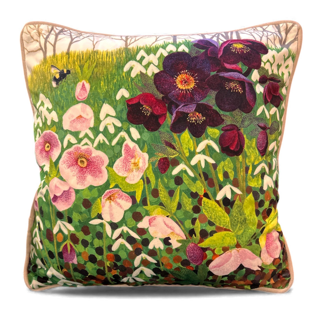 Premium velvet cushion featuring exclusive hellebore artwork by Susan Entwistle