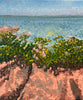 An original painting of a coastal scene featuring pink hued shoreline rocks and vibrant green seaweed painted in my signature pointillist style.