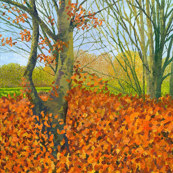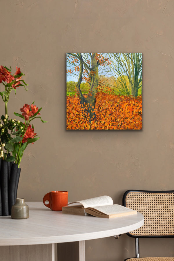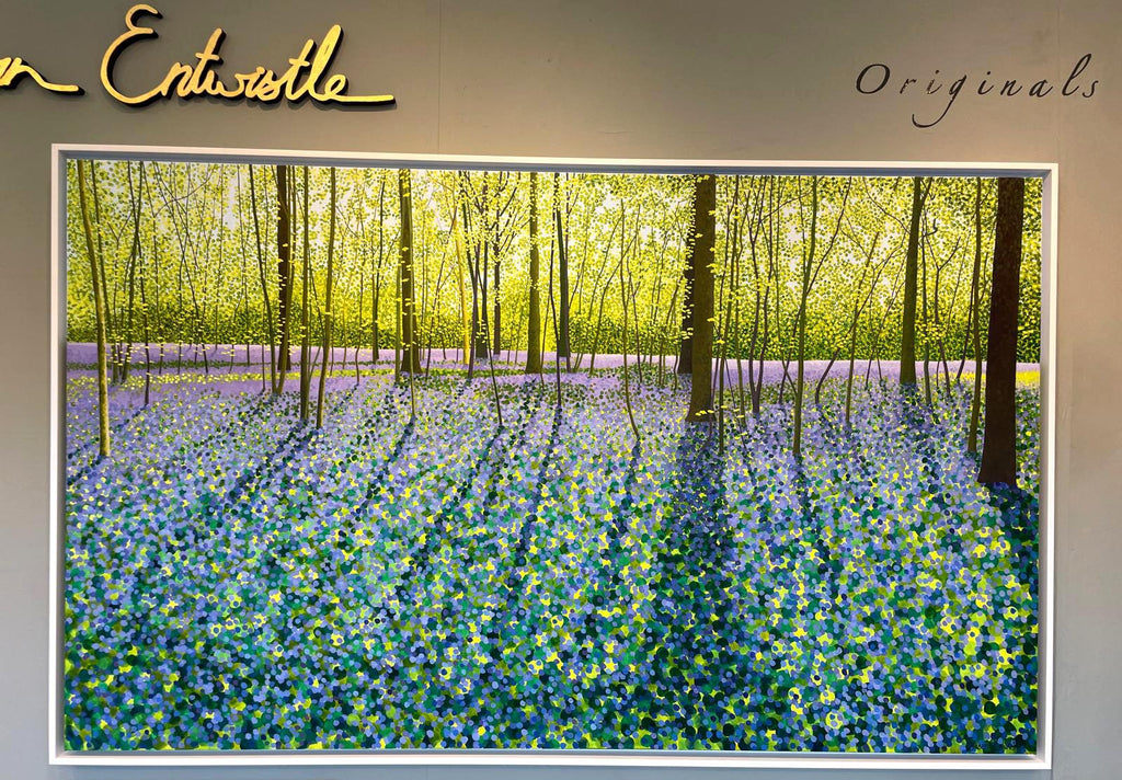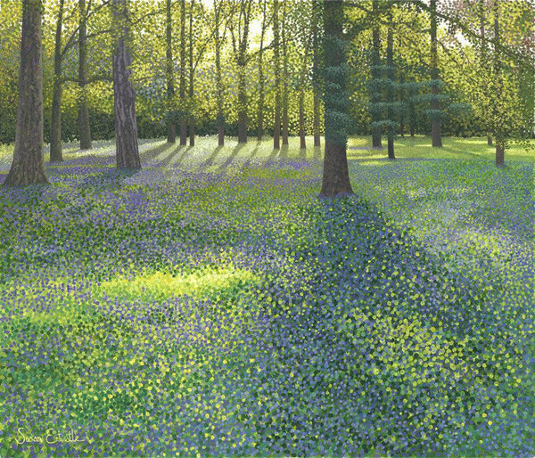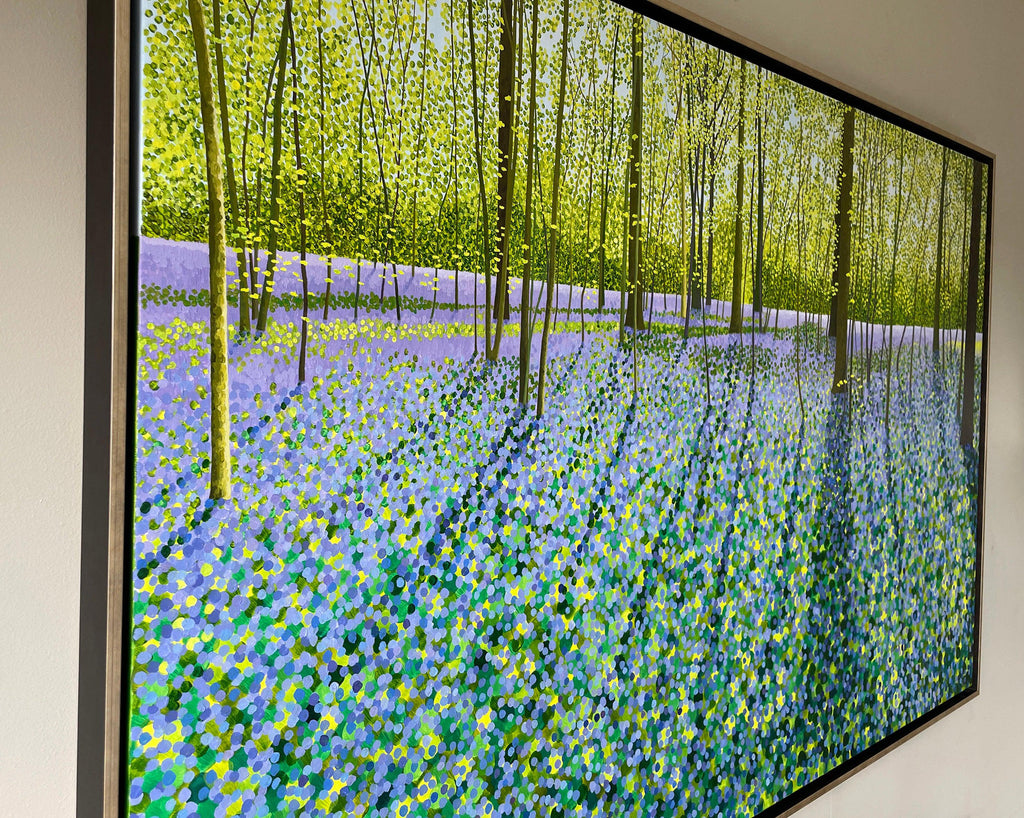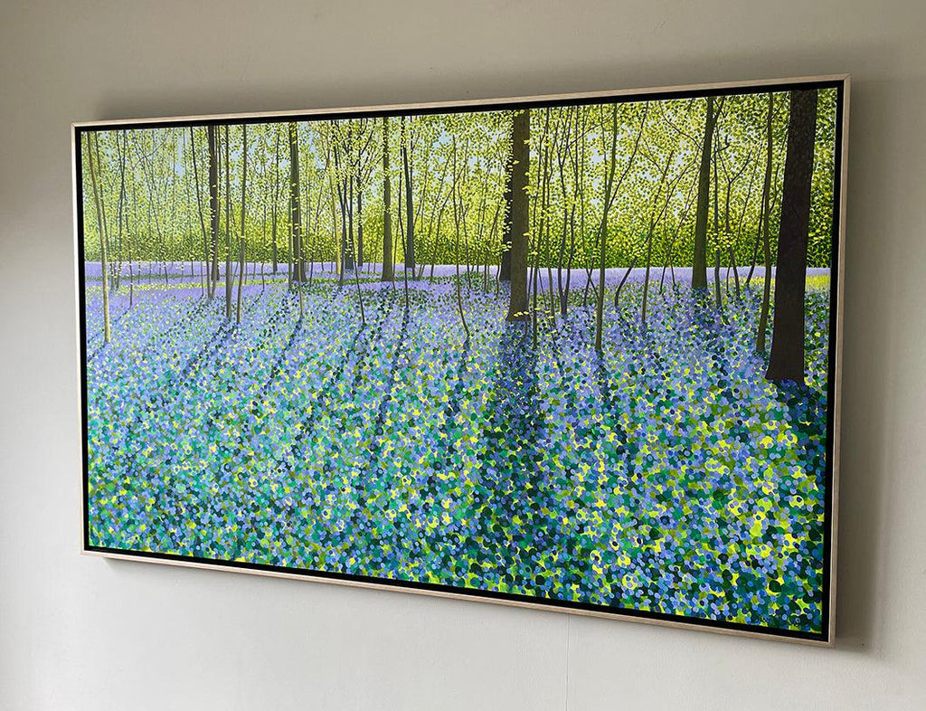 An original painting of Bluebells in Spring time, featuring sunlight streaming through, capturing the leaves glowing a lime green and the bluebell carpet in blues to mauves.