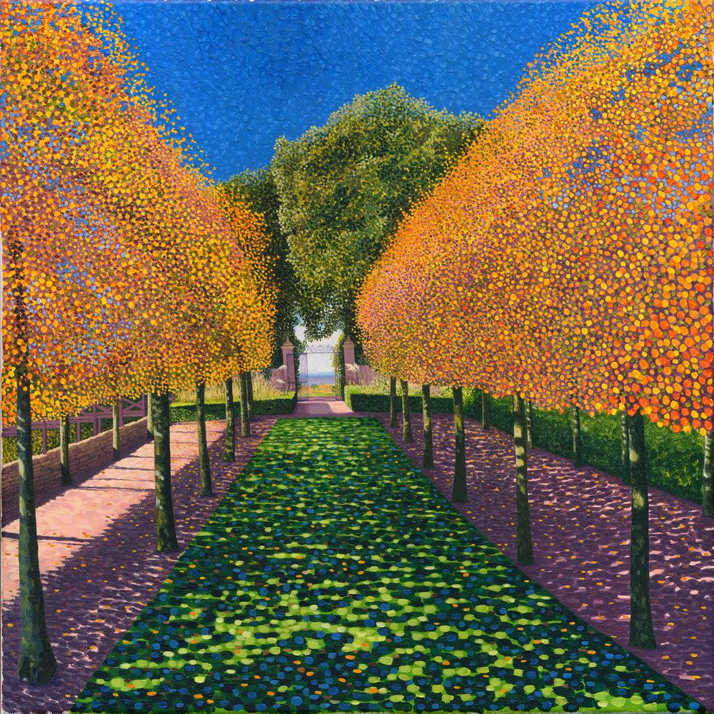 A pointillist style painting of the avenue of pleached hornbeam at Hidcote Manor Gardens, Gloucestershire
