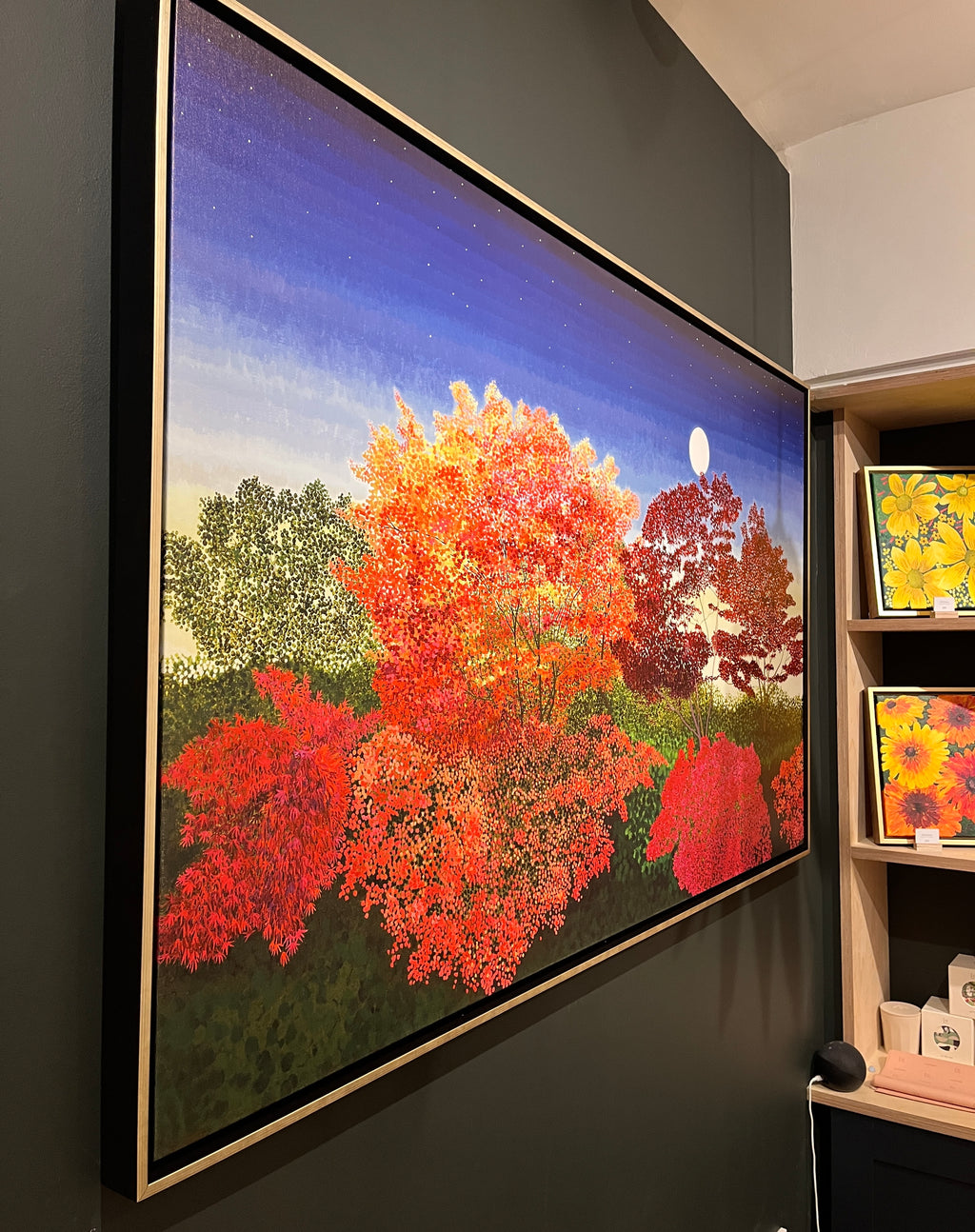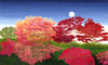 • Framed around this vivid foliage is a rich, deep-blue sky—either at dawn or dusk—creating a dramatic backdrop. A moon peeks through the treetops, adding quiet depth and a sense of calm.
