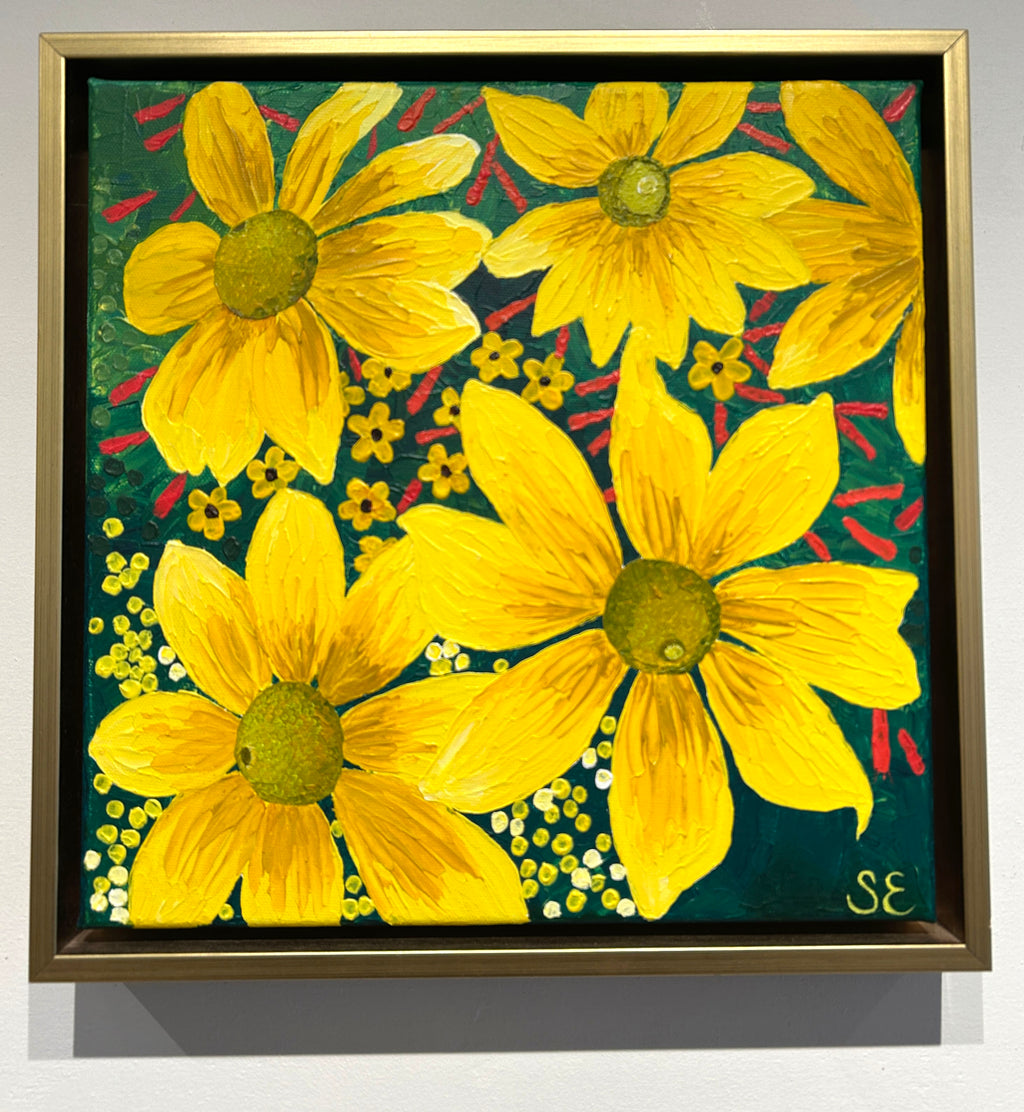 An original painting of Prairie Sun bright yellow flowers painted from Monet's garden in Giverny.