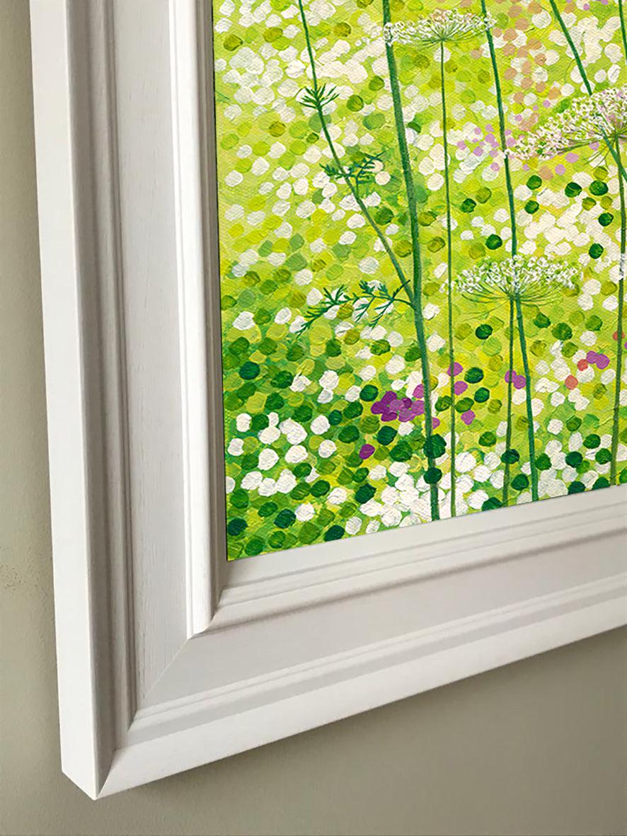 Queen Anne's Lace also known as daucus carota, wild carrot, bird's nest or Bishop's Lace is a wild flower that grows in verges along country lanes and is featured in this original painting.