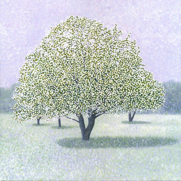 A winter painting of muted colours featuring a snow crab apple tree.